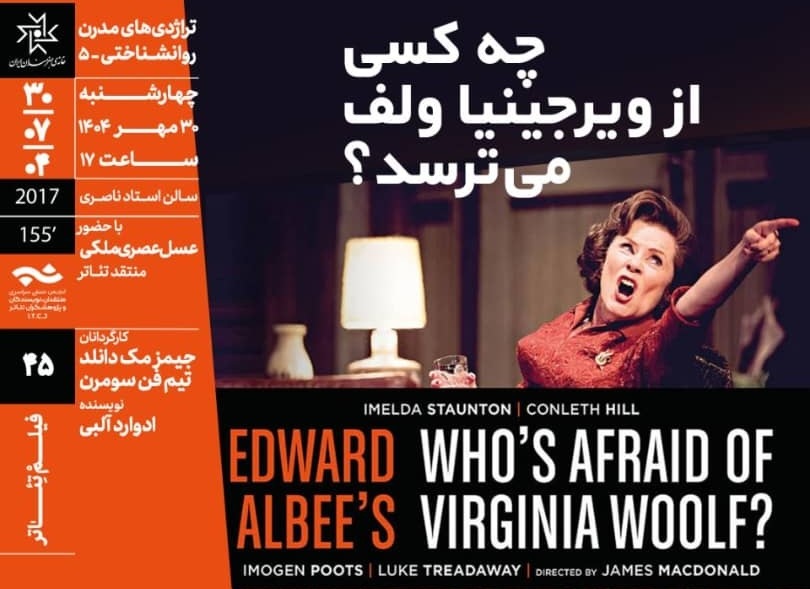 فیلم‌تئاتر «چه کسی از ویرجینیا ولف می‌ترسد؟»، محصول ۲۰۱۷ هلند [از بسته تراژدی‌های مدرن روان‌شناختی] با همکاری مشترک انجمن منتقدان، نویسندگان و پژوهشگران خانه تئاتر و سینماتک خانه هنرمندان ایران روی پرده می رود و پس از نمایش، نشست نقد و بررسی آن با حضور عسل عصری ملکی (منتقد تئاتر) برگزار می‌شود.